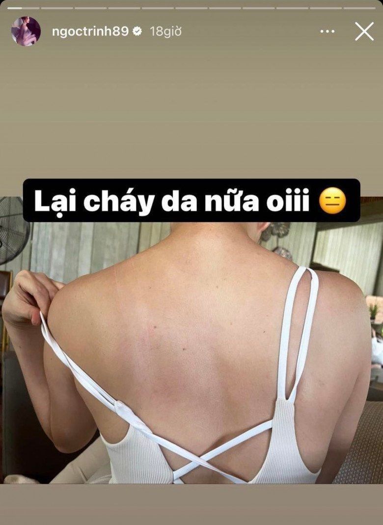 Trên story Instagram, Ngọc Trinh trước đó đã đăng tải hình ảnh chụp camera thường với phần lưng cháy nắng, loang lổ kém xinh. Cô than thở: "Lại cháy da nữa rồi".