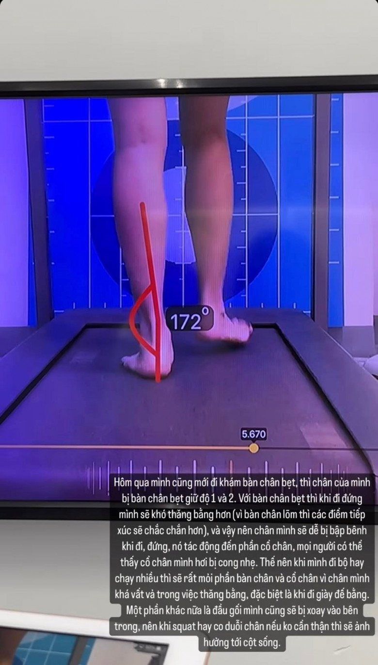 Khánh Linh lại tìm đến Pilates nhằm để trị liệu tình trạng bàn chân bẹt, không mở được gối khi squat và bị đau lưng dưới khi tập gym.