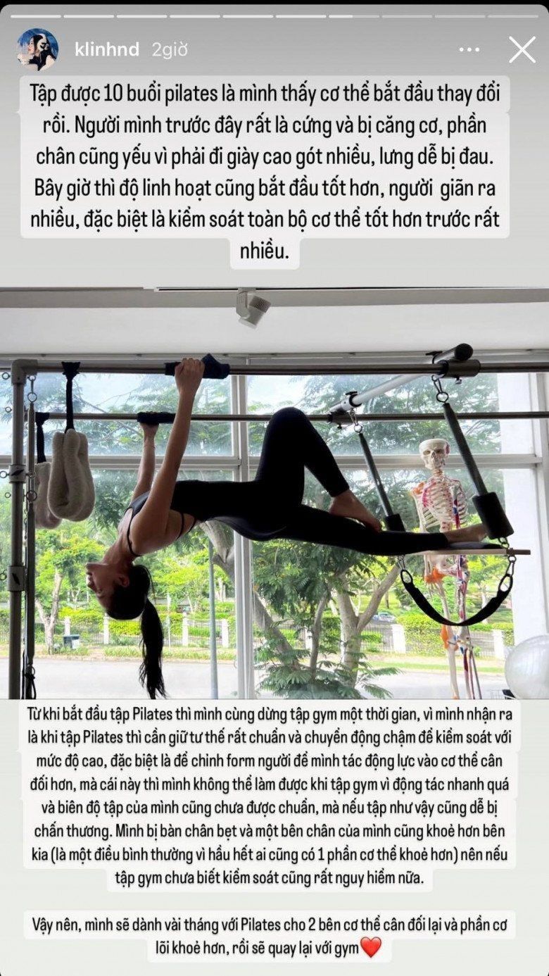 Người đẹp hào hứng khoe lên trang cá nhân với chú thích: "Thử bộ môn mới nà cả nhà". Trong video ngắn, không khó để công chúng nhận ra, đây là chiếc máy chuyên dụng giành cho các động tác nhấc bổng người và bay lên khá khó. Pilates là sự kết hợp của yoga và máy móc. Do đó, nó đang là bộ môn mới được nhiều ngôi sao, hotgirl nổi tiếng lăng xê vì vừa đốt năng lượng lại có thể xả stress hiệu quả.