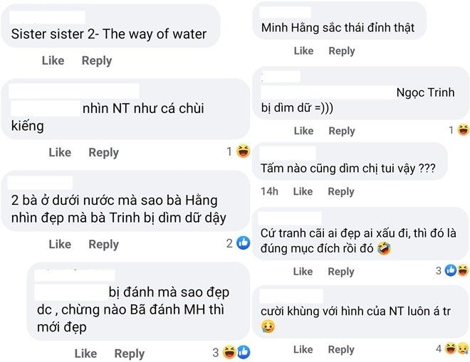 Đáng nói nhất là trong loạt ảnh chính thức ghi lại cảnh đại chiến này, Ngọc Trinh bị "dìm hàng" vô cùng thảm thương. So với một Minh Hằng toát lên sắc thái đầy tự tin và kiêu hãnh thì đối thủ của cô lại lộ toàn khuyết điểm đùi to chân ngắn, biểu cảm bị chê trông như "cá lau kính".