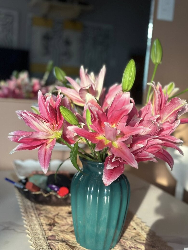 Những bình hoa tươi khoe sắc rực rỡ trên bàn trà trở thành điểm nhấn nghệ thuật, giúp không gian phòng khách luôn bừng sáng và tràn đầy sức sống mới.