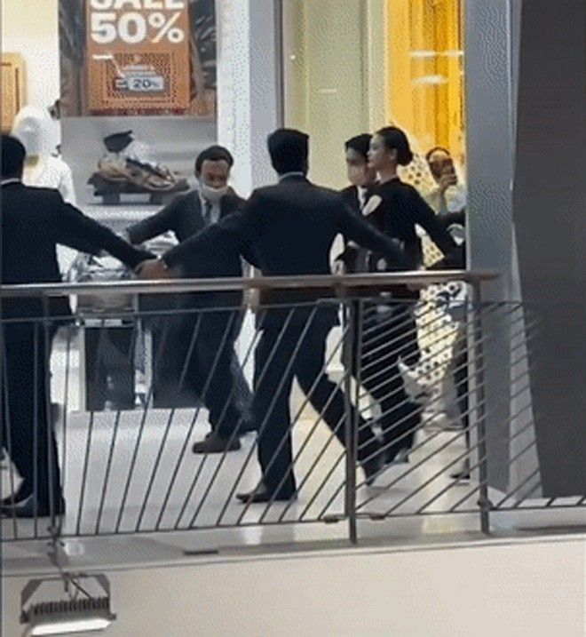 Hình ảnh cô được nhân viên bảo vệ vây quanh tại trung tâm thương mại gây sốc.