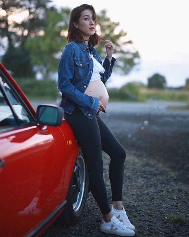 Trong hình, Chung Gia Hân mặc áo ngắn khoe bụng. Cô khoác bên ngoài áo denim xanh và quần ôm sát. Chung Gia Hân được khen ngợi là bà bầu ấn tượng nhất showbiz lúc này. Rất nhiều bạn của cô là Cẩu Vân Tuệ, Dương Di, Hồ Định Hân... đã gửi lời chúc nữ diễn viên "mẹ tròn con vuông".