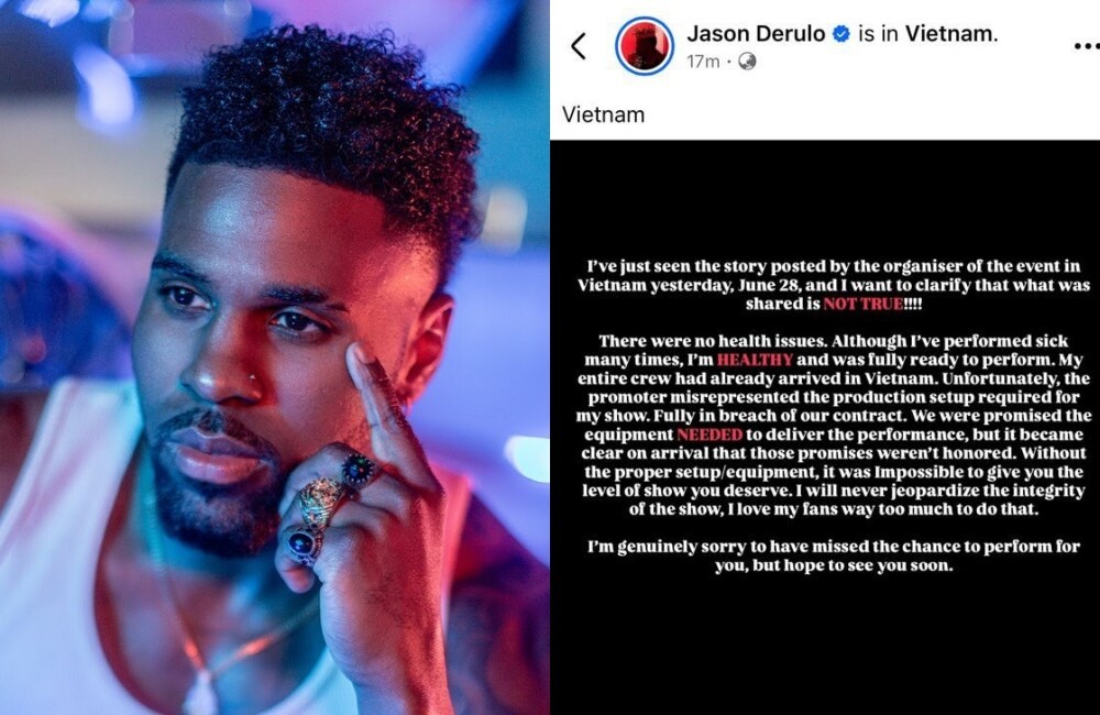 Phía đơn vị này cho biết đã thanh toán 100% về chi phí, đáp ứng mọi yêu cầu, mong muốn từ ngôi sao người Mỹ, bao gồm việc vũ công, dàn dựng tiết mục. Ban đầu, phía ca sĩ thông báo dời lịch bay sang 27/6, rồi tiếp tục thông báo hoãn tới sáng 28/6. Tuy nhiên khi ban tổ chức cùng fan ra sân bay đón Jason Derulo thì chỉ gặp 2 người trong đội quản lý của anh. Lúc này, phía ca sĩ nói anh hủy show "vì vấn đề sức khỏe".