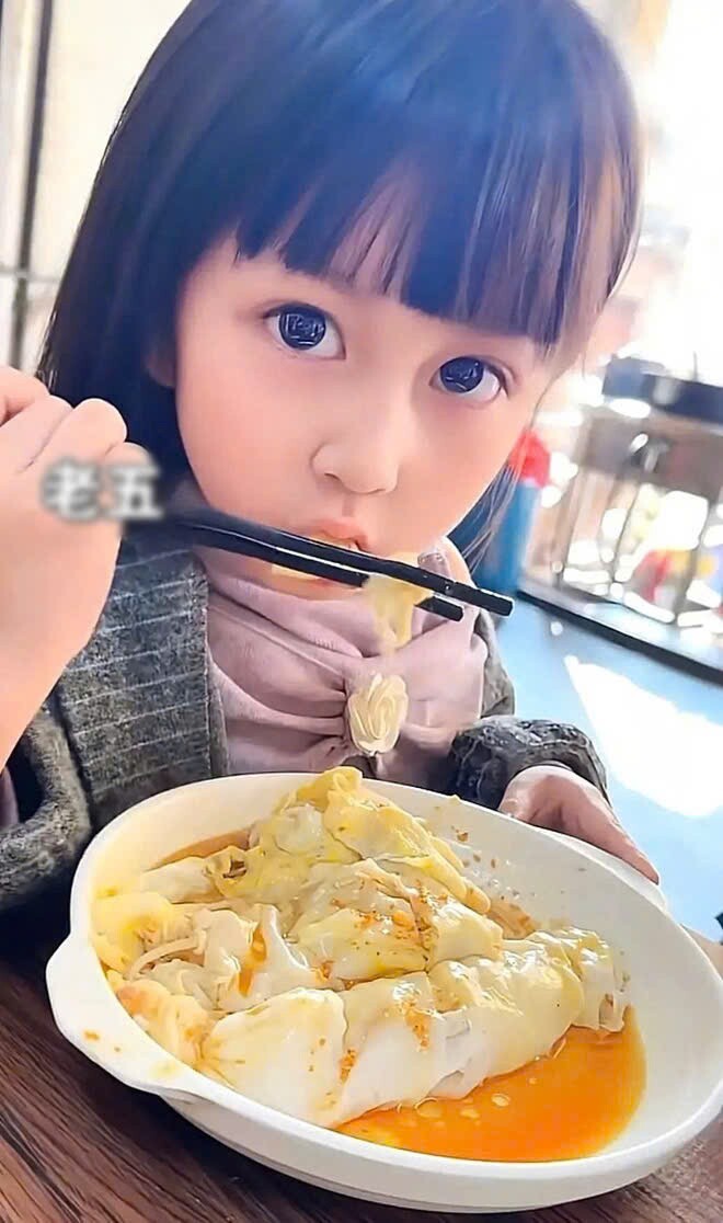 Cô con gái cả sở hữu gương mặt thanh tú, mái tóc dài suôn mượt, vừa ăn vừa mỉm cười nhẹ khi nhìn về phía ống kính.