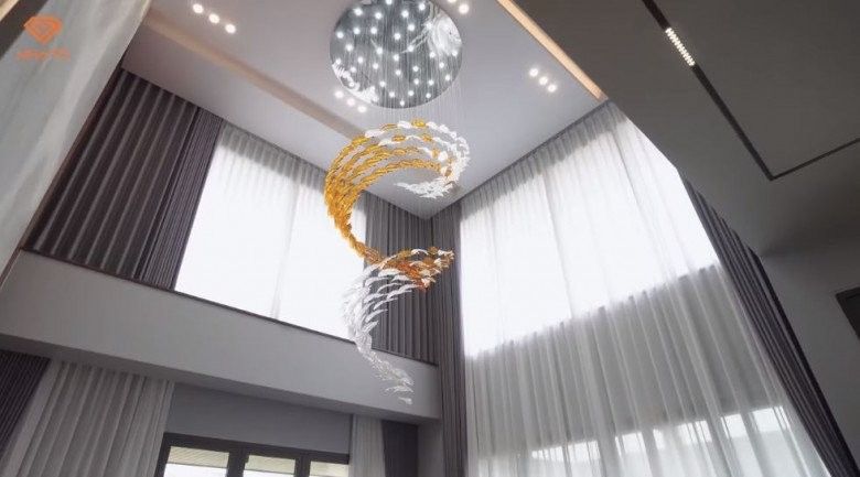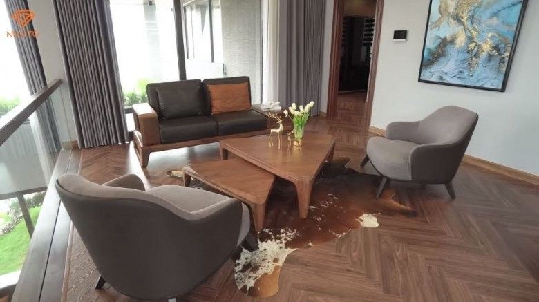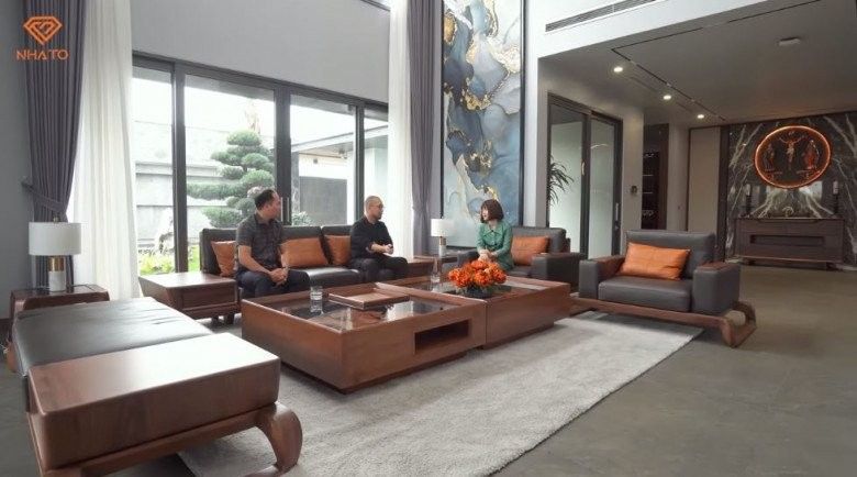 Bước vào phòng khách là một bộ bàn trà cỡ lớn với tông màu nâu đen. Hệ thống sưởi điện tử mang đến cảm giác ấm cúng cho phòng khách. Điểm nhấn của căn nhà chính là không gian thông tầng, tạo cảm giác rộng rãi, bề thế, đồng thời giúp các thành viên trong gia đình liên kết với nhau tốt hơn.