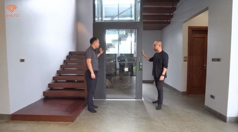 Dù không người ở nhưng trong nhà vẫn lắp thang máy hiện đại với cửa tự động. Xung quanh không có hệ khung nên cảm giác rất thông thoáng, như đi ở giữa nhà.