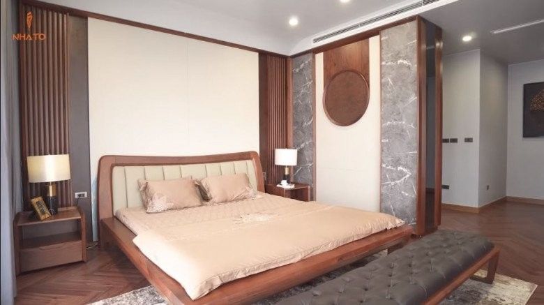 Phòng ngủ sử dụng gỗ óc chó làm điểm nhấn, kết hợp một số vật liệu công nghiệp nhằm tăng tính sang trọng cho căn phòng. Phòng ngủ master của gia chủ có không gian thay đồ riêng, tách biệt với không gian ngủ.