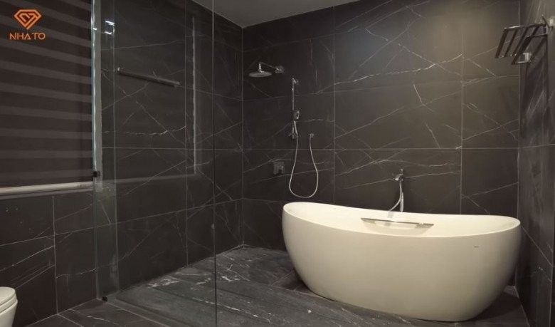 Nhà tắm hiện đại chẳng kém khách sạn 5 sao với tông tối màu.