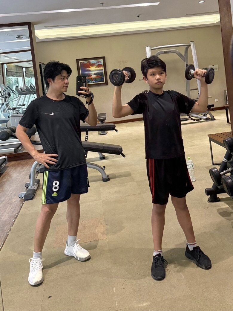 Nguyễn Văn Chung cùng con trai tập luyện thể thao.