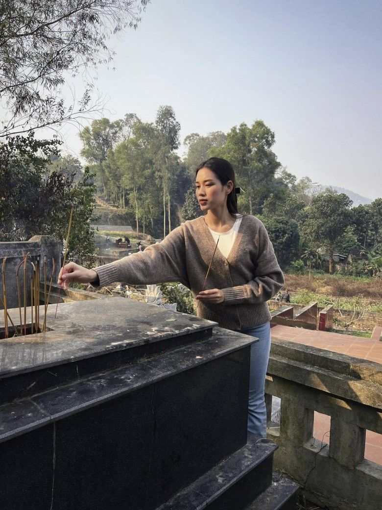Hoa hậu Đỗ Thị Hà lại có một kì nghỉ Tết an yên và hạnh phúc ở quê nhà Thanh Hoá. Nếu như năm ngoái, cô còn cập rập với việc mắc Covid và thi cử thì nay cô đã được thong thả hơn. Nàng hậu đi tảo mộ với set đồ lịch sự.
