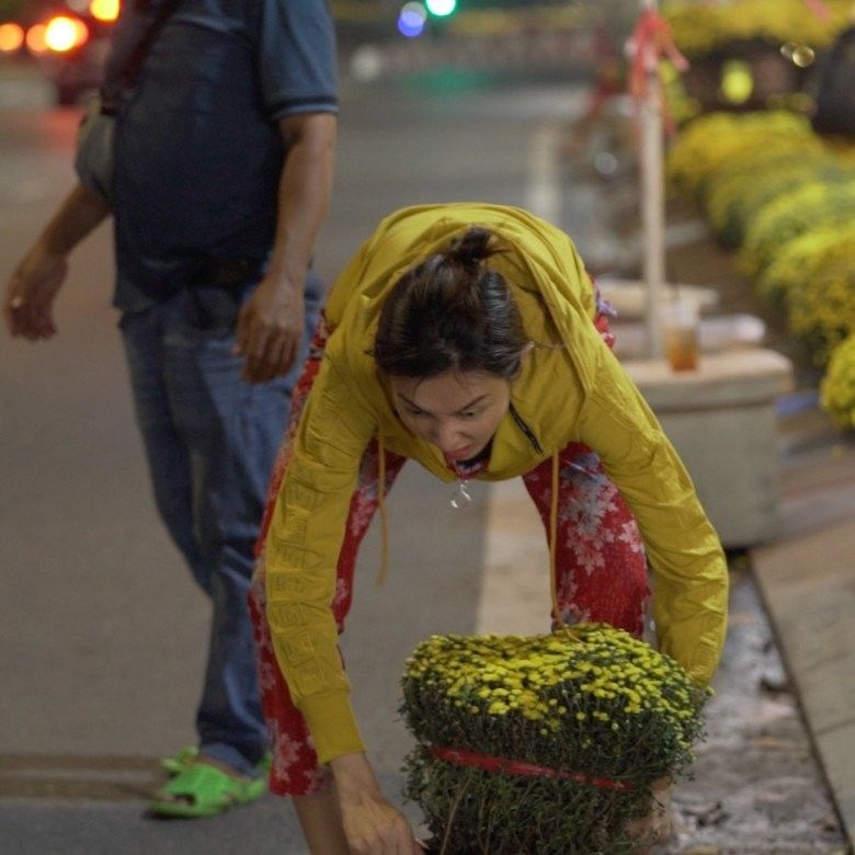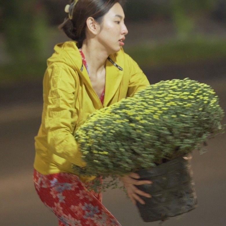 Không những diện đồ bộ, cô còn để mặt mộc, kẹp tóc càng cua và hăng hái bê chậu, bán hoa. Hình ảnh đã góp phần làm cho tên tuổi của nàng hậu thêm phần đẹp hơn trong mắt công chúng.
