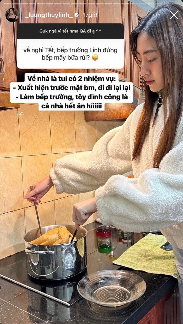 Lương Thuỳ Linh về quê nhà cũng vững phong độ "chánh cung" của Miss World Vietnam. Chân dài khoe rằng, về nhà bên cạnh việc tiếp khách, cô còn làm bếp trưởng. Nàng hậu vào bếp với áo lông ấm áp. Tuy có hơi lộng lẫy hơn so với hội chị em mình nhưng câu chuyện của chân dài 1m22 gốc Cao Bằng mới là điều chú ý.