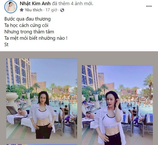 Ít giờ trước, Nhật Kim Anh bất ngờ có một chia sẻ khá tiêu cực, nhắc đến chuyện “đau thương”, “mệt mỏi” nhận được sự quan tâm lớn của cư dân mạng. Cụ thể, nữ diễn viên viết: “Bước qua đau thương, ta học cách cứng cỏi. Nhưng trong thâm tâm, ta mệt mỏi biết nhường nào”. Thông qua những chia sẻ này, Nhật Kim Anh như muốn ám chỉ đến thời gian dài khó khăn mà cô mới gặp phải.