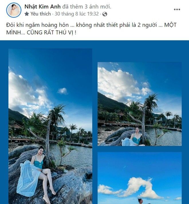 Đây không phải là lần đầu Nhật Kim Anh thể hiện sự nỗi lòng của mình lên mạng xã hội. Trước đó, cô từng đăng tải nhiều bài viết đáng chú ý: “Đôi khi ngắm hoàng hôn không nhất thiết phải là 2 người. Một mình cũng rất thú vị”, “Mong manh hay mạnh mẽ. Bẽ bàng và dang dở. Bỡ ngỡ như giấc mơ”.