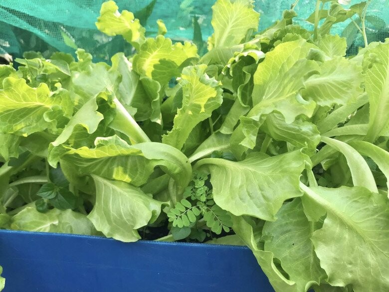 Bên cạnh đó, các loại rau ăn lá như cải xanh, rau muống, xà lách tươi non, mơn mởn trong các khay nhựa được sắp xếp khoa học càng làm phong phú thêm cho "thực đơn" hàng ngày của gia đình.