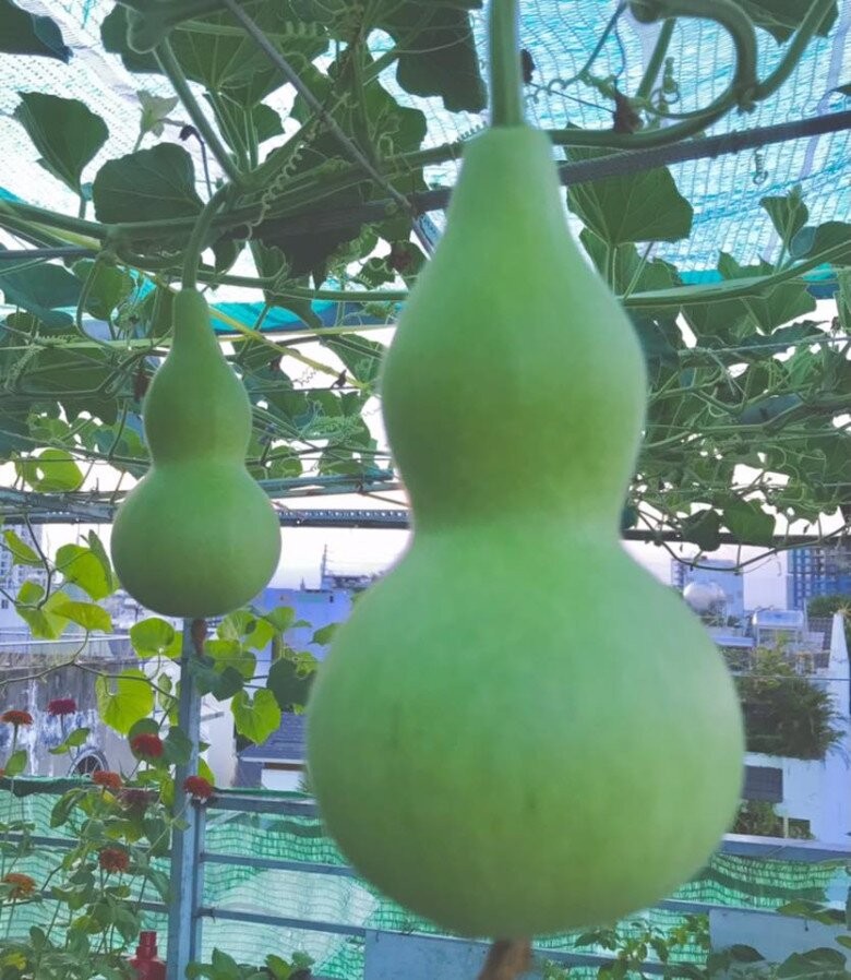 Những trái bầu hồ lô khoe dáng độc đáo đầy nghệ thuật trên giàn, trông y như những tác phẩm điêu khắc tự nhiên giữa không gian xanh mướt tầng mây.