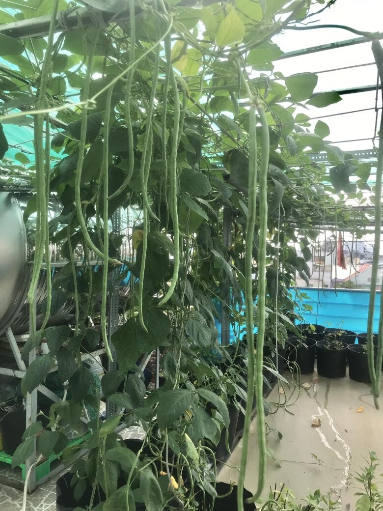 Giàn đậu đũa mùa mới sai trĩu quả, từng chùm dài mướt rượt sau thành quả của sự lao động miệt mài của nam nghệ sĩ, làm nhiều người nhìn mà thích thú.