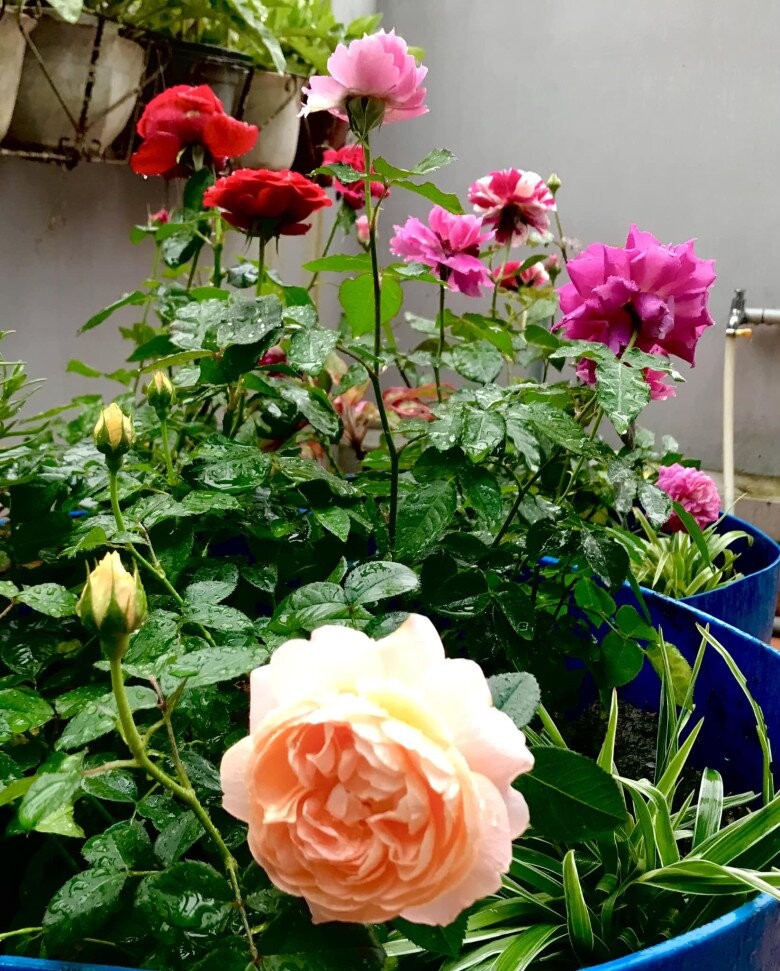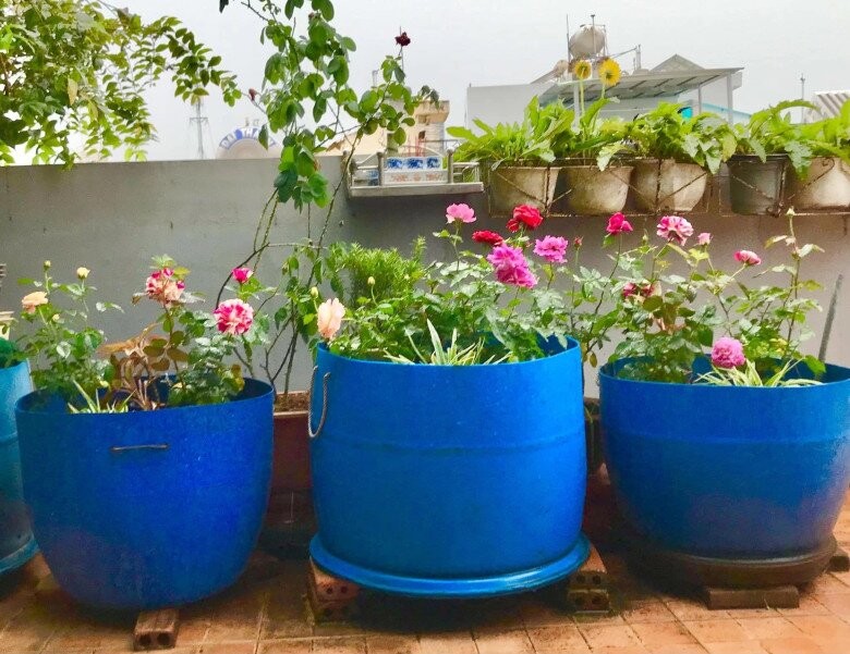 Ông khéo léo tận dụng những chiếc thùng nhựa xanh lớn, biến chúng thành những chậu trồng hồng độc đáo. Những giò lan cũng rực rỡ không kém.