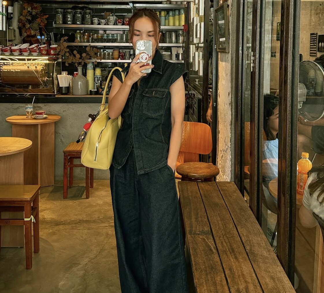 Nữ ca sĩ diện áo jeans không tay cùng quần jeans ống rộng đồng bộ. Chất liệu jeans cứng cáp giúp tổng thể đứng dáng, trong khi phom suông tạo cảm giác thoải mái, trẻ trung.