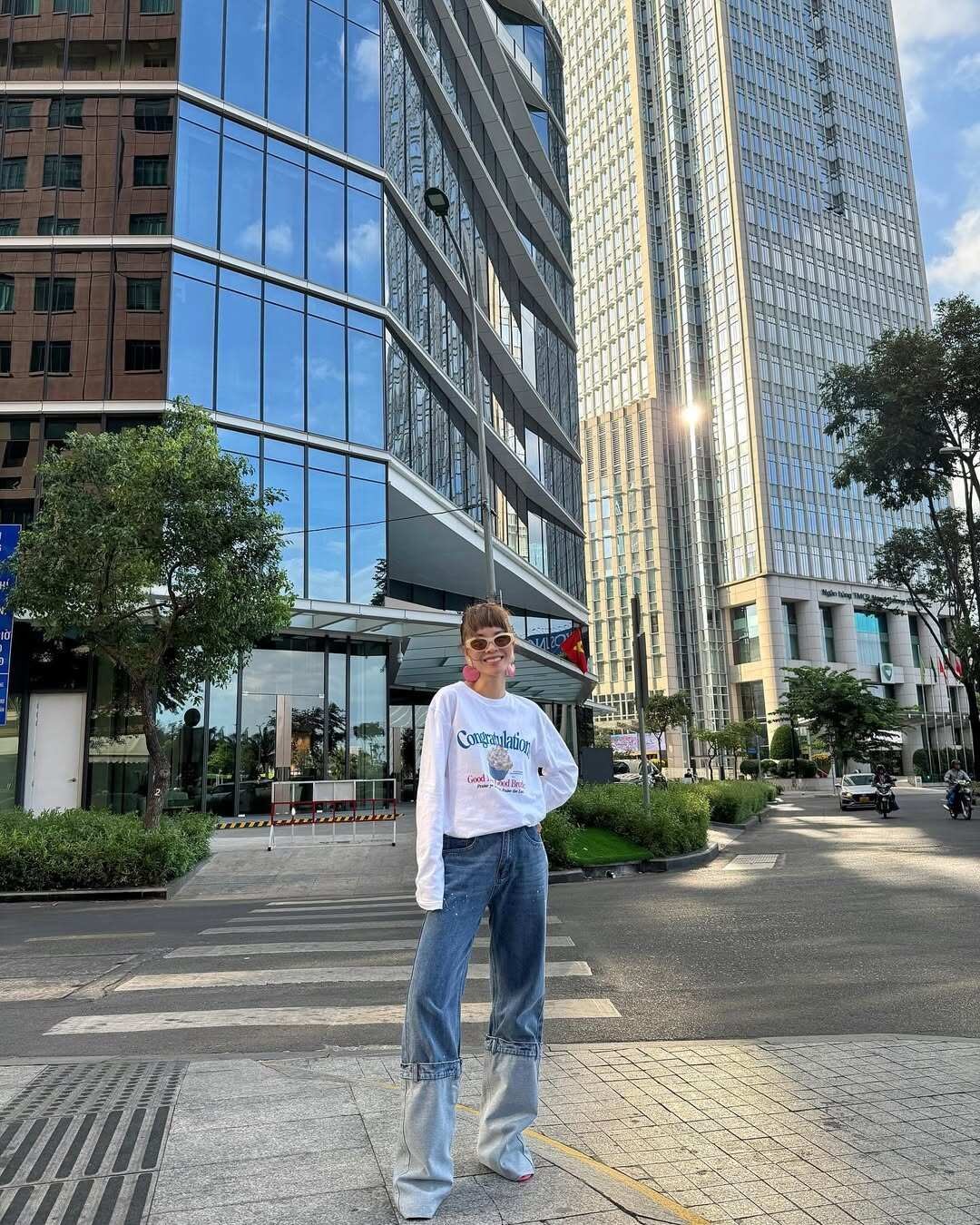 Một outfit khác ghi điểm mạnh là áo thun dài tay in chữ phối cùng quần jeans xanh dáng suông, gấu xắn nhẹ. Set đồ này mang tinh thần rất đời, trẻ trung và thoải mái. Đây cũng là kiểu phối đồ mà nhiều chị em U40 hoàn toàn có thể áp dụng hàng ngày mà không lo bị chê cưa sừng làm nghé.