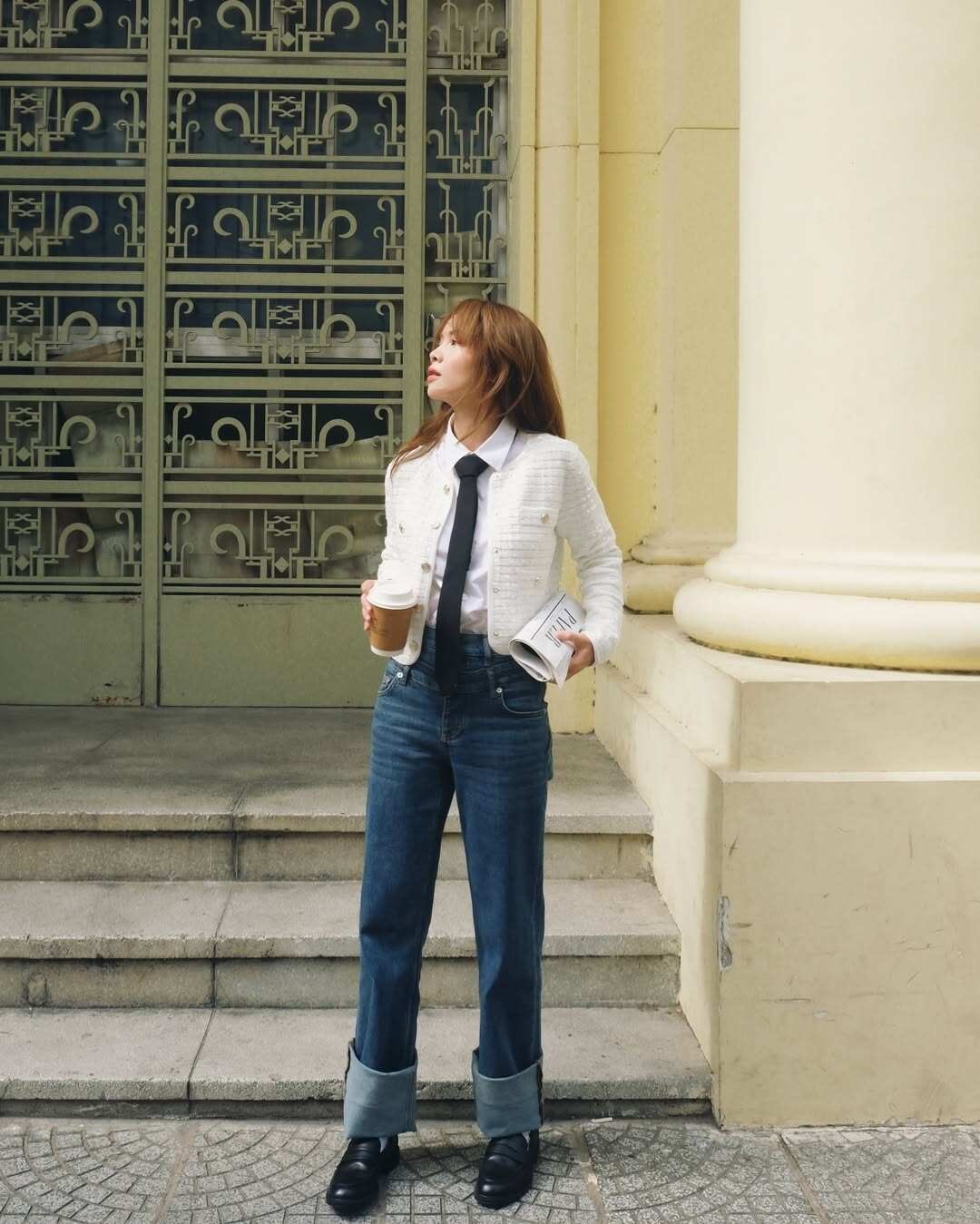 Yến Trang khéo léo kết hợp áo khoác tweed trắng dáng ngắn cùng jeans xanh và giày đế thấp. Tweed vốn là chất liệu dễ cộng tuổi, nhưng khi đi cùng jeans, tổng thể lại trở nên nhẹ nhàng và trẻ trung hơn hẳn. Đây là ví dụ điển hình cho cách phối đồ giúp phụ nữ ngoài 40 vừa giữ được vẻ lịch sự, vừa không bị "dừ".