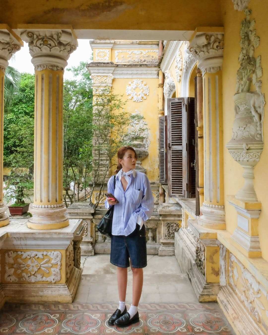 Trong loạt ảnh du lịch, Yến Trang diện sơ mi xanh nhạt phối cùng quần short jeans, tất cao cổ và giày bệt. Set đồ mang đậm tinh thần nghỉ dưỡng, thoải mái nhưng vẫn rất gọn gàng. Quần short jeans giúp đôi chân trông thanh thoát hơn, trong khi sơ mi dáng rộng giữ được sự kín đáo cần thiết.