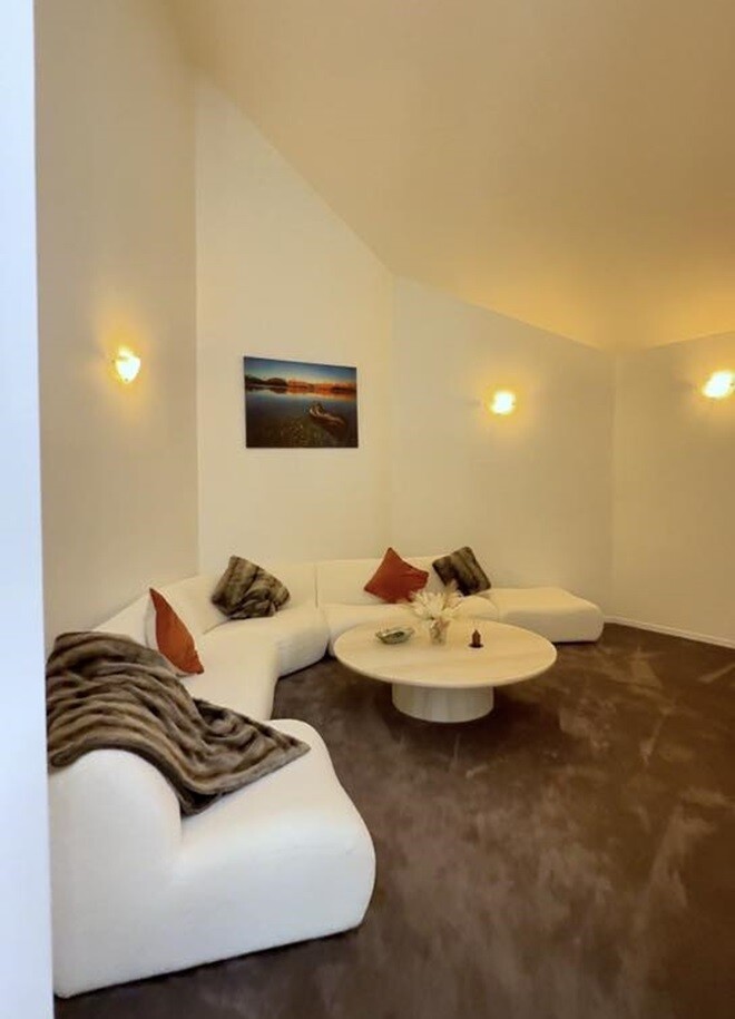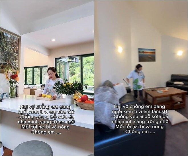 Một bộ sofa khác trong nhà cũng được đổi sang màu sáng sau câu chuyện của cô: “Hai vợ chồng em đang ngồi xem tivi, em tâm sự: Chồng yêu ơi, bộ sofa da nhà mình sang trọng nhở. Mỗi tội hơi bí và nóng".