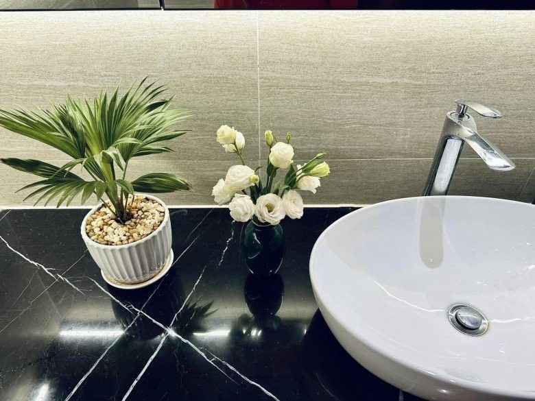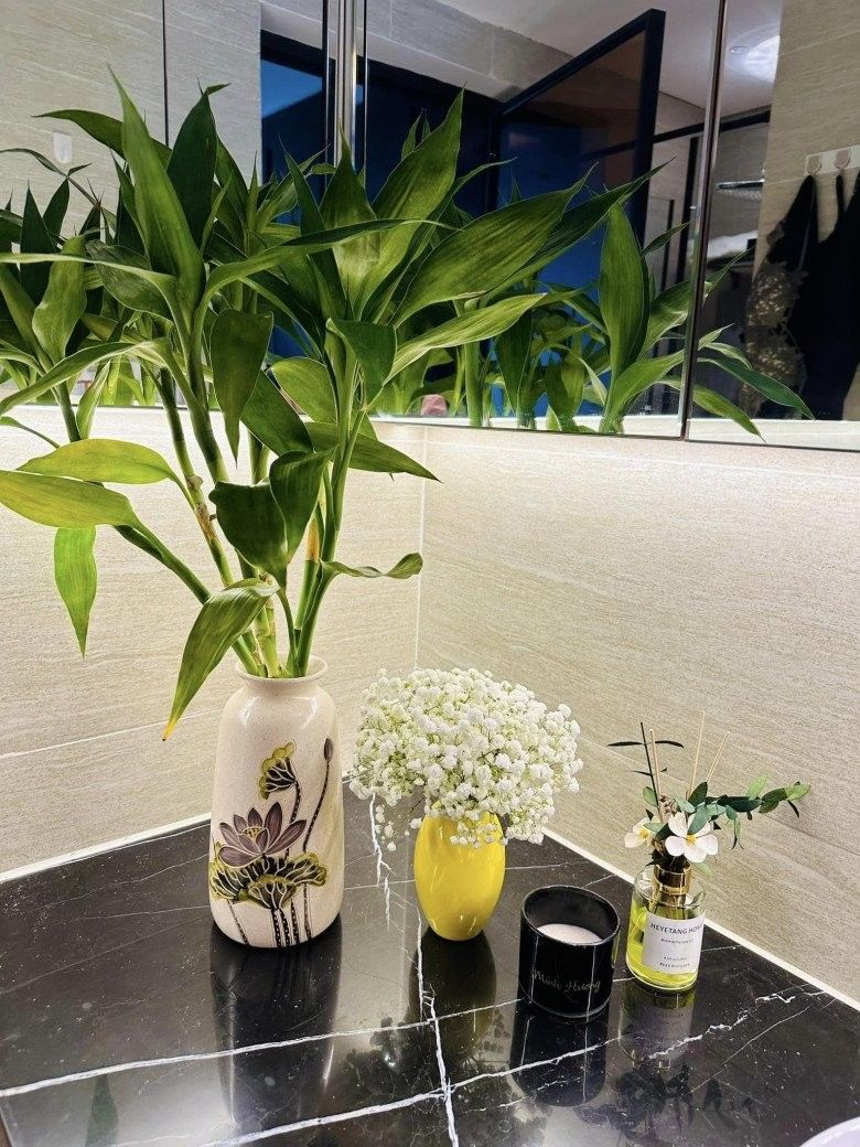 Ngay cả trong nhà vệ sinh, Minh Hương cũng trưng bày cây xanh và những lọ hoa nhỏ nhỏ trông rất nghệ thuật.