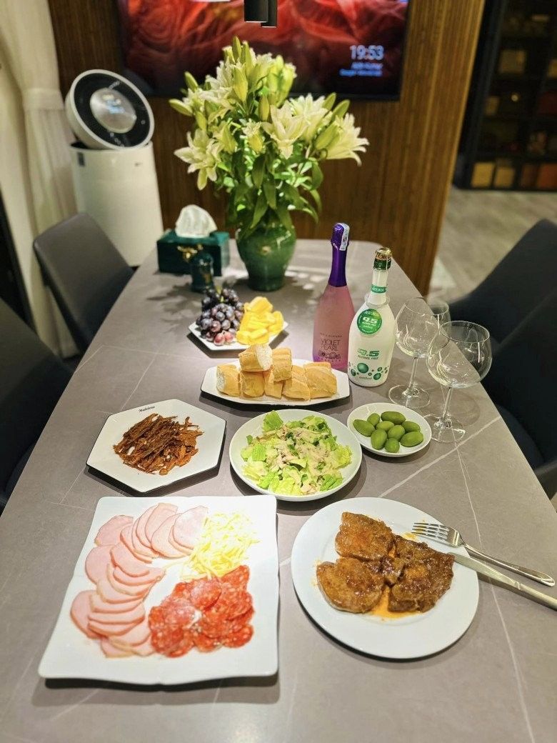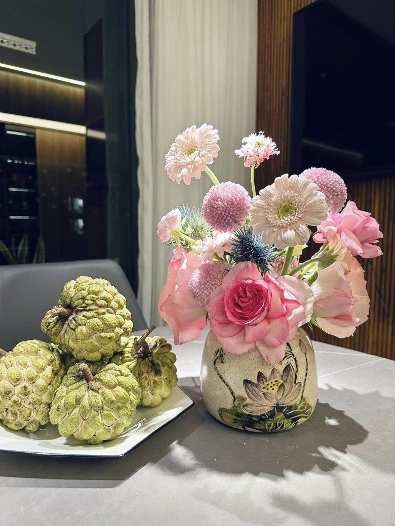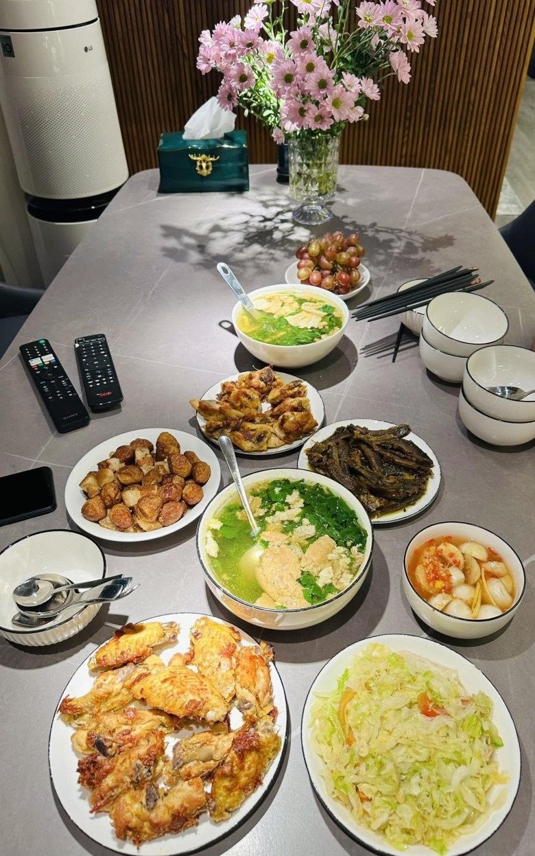 Bàn ăn ngoài những món ăn thơm ngon, chỉn chu người đẹp tự nấu cho chồng còn còn không thể thiếu những lọ hoa xinh đẹp.