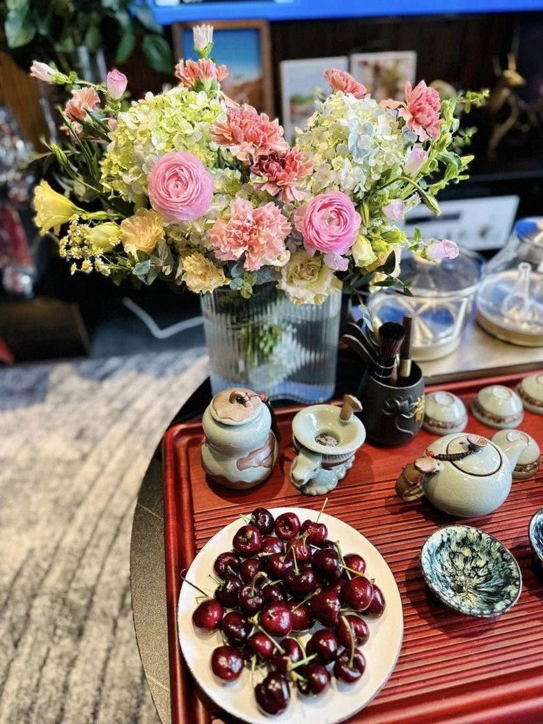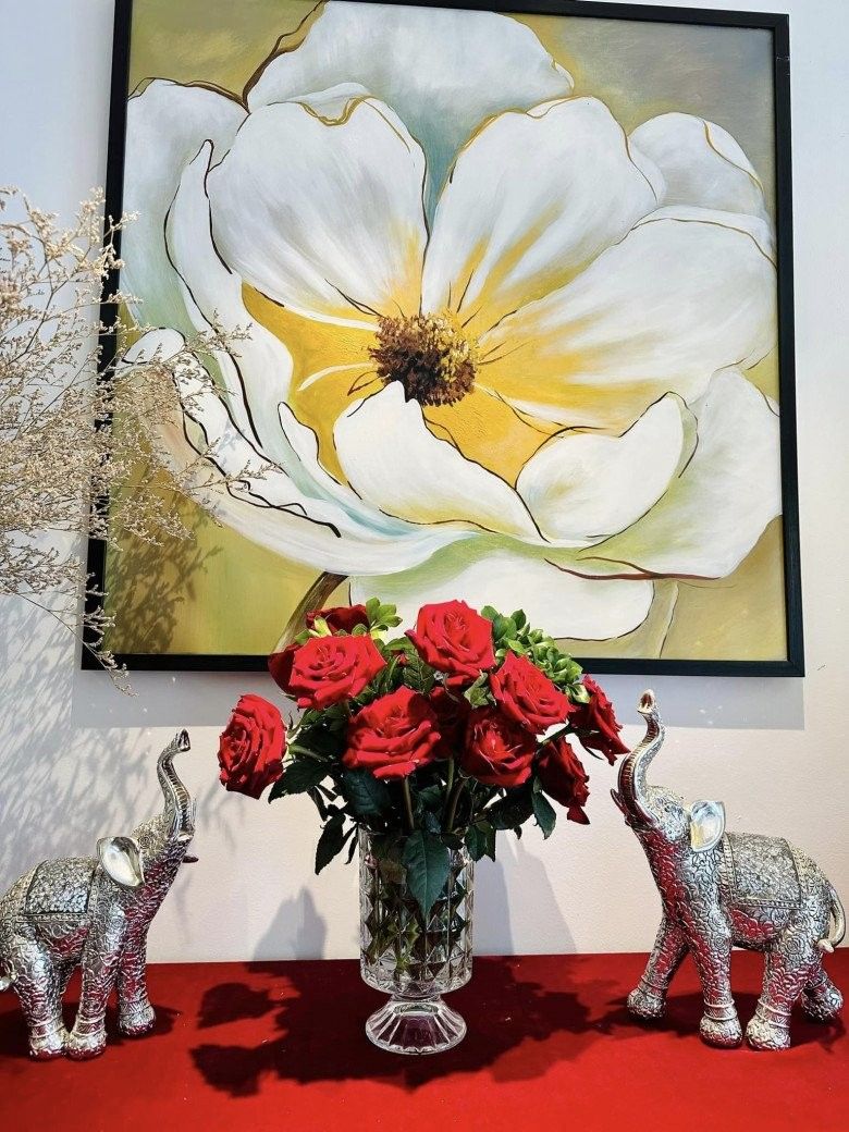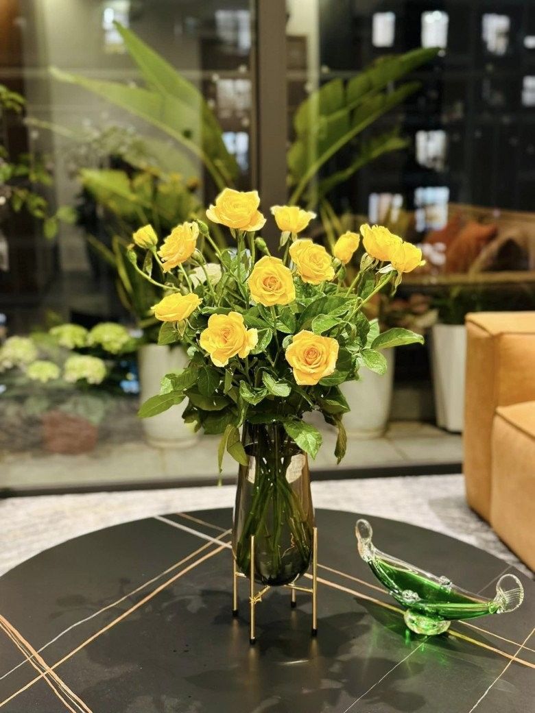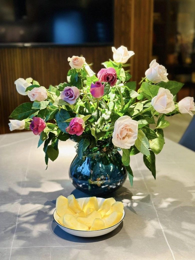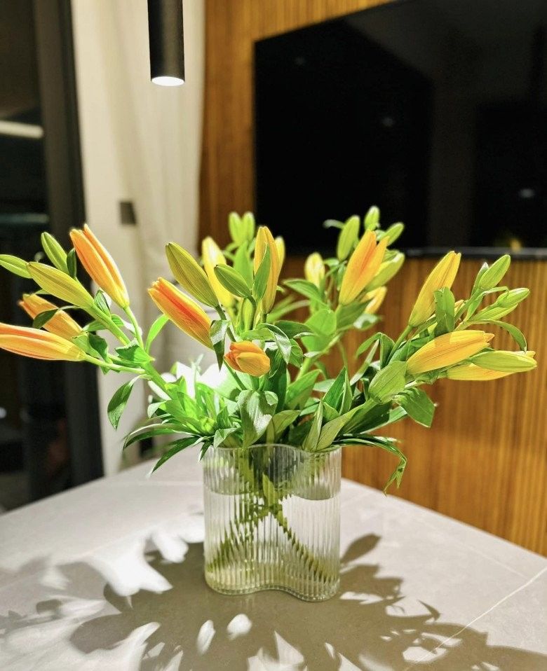Hoa hồng, hoa ly... bung nở trong căn hộ sang trọng. Ở mỗi chiếc bàn dù ở phòng ngủ, phòng khách hay gian bếp đều được bày biện những bình hoa tươi khác nhau.