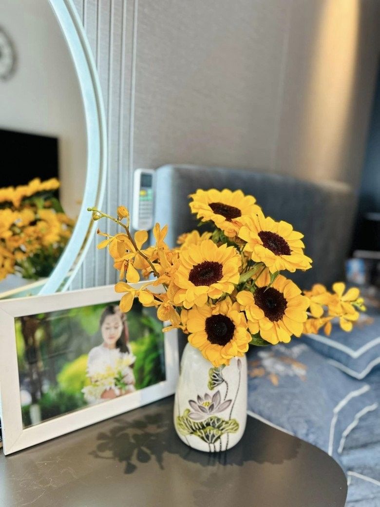 Dù công việc khá bận rộn nhưng Thượng úy Minh Hương vẫn dành thời gian chăm chút cho tổ ấm. Cô thích trang trí nhiều hoa tươi trong căn nhà của mình.