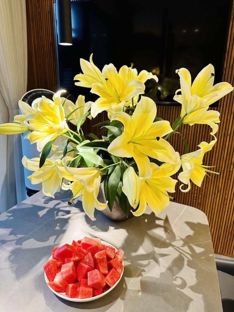 Mới đây, cô khoe những bức ảnh mới trong căn hộ và cho biết: "Cả ngày bận rộn giờ thì ngồi ngắm các em chờ nở toe nào".