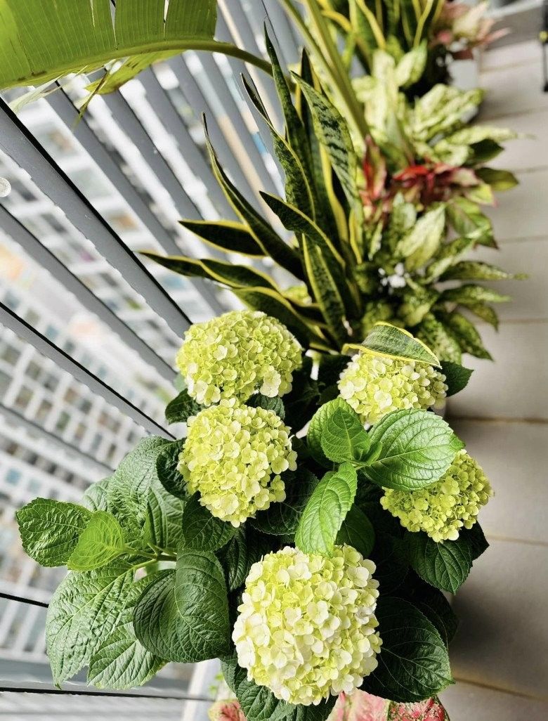 Cô dí dỏm cho biết nhà mình "được cái màu sắc". Ban công của nhà Minh Hương cũng có rất nhiều cây, cô còn trồng hoa cẩm tú cầu xinh xắn.
