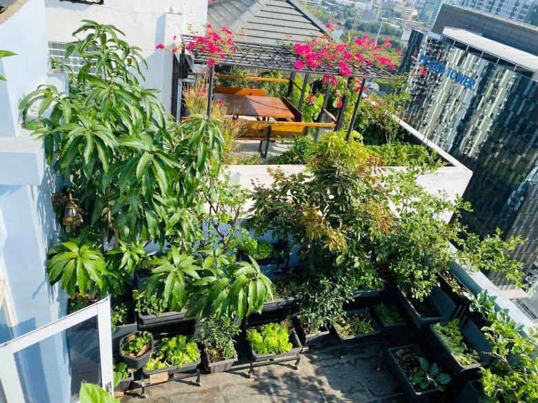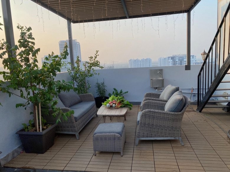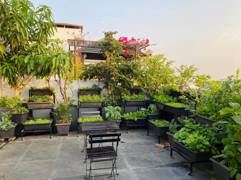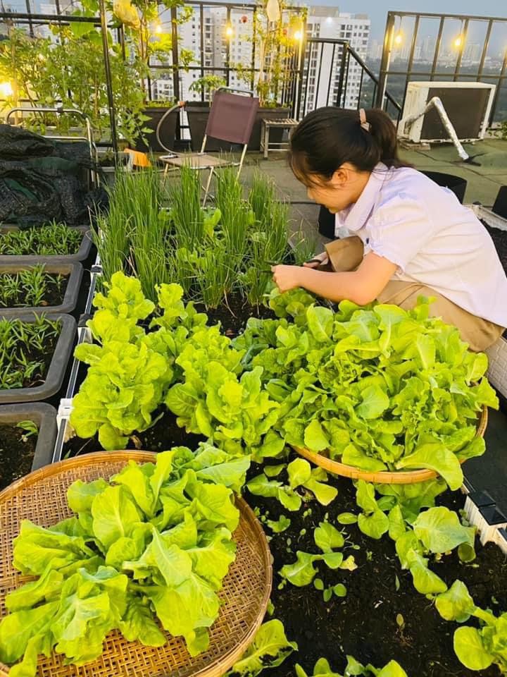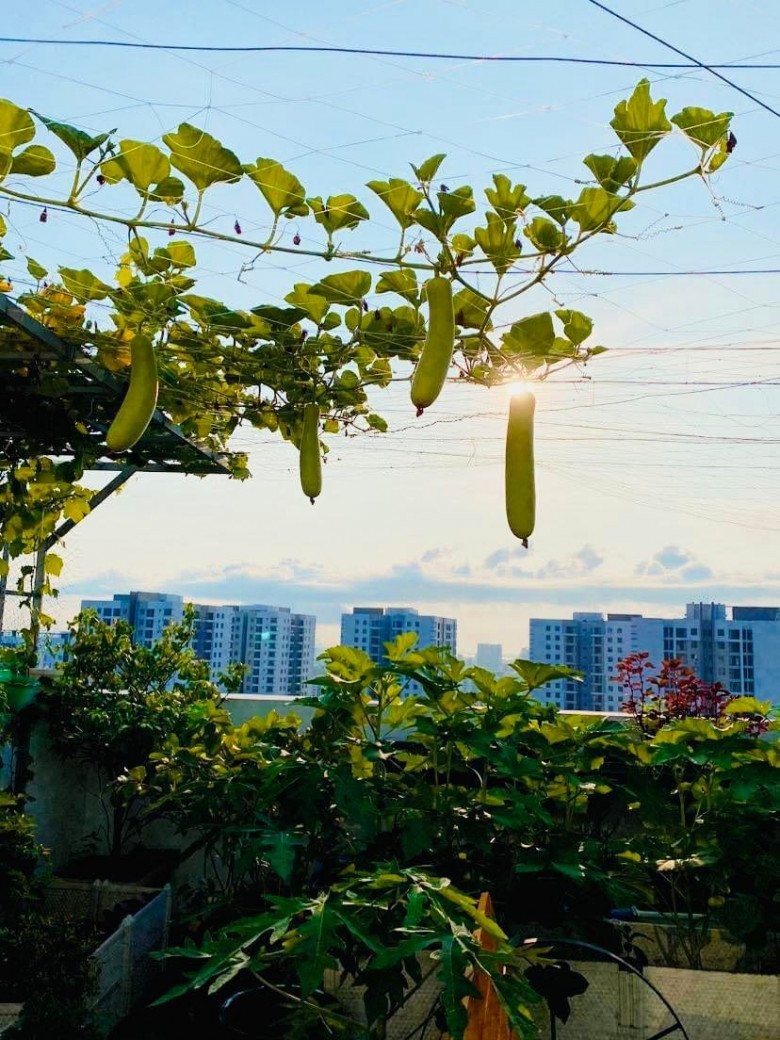 Vườn rau thay đổi thói quen của cả gia đình, mỗi người trở nên yêu cây cối hơn khi mỗi ngày đều ngắm nó mọc ra nhánh mới, cái hoa mới và trông chờ ngắm nhìn nó kết trái. Buổi chiều có thời gian, cả nhà sẽ rủ nhau lên sân thượng, ngồi chơi, uống trà và trò chuyện. Trẻ con thì xem bướm xem ong, tò mò về những con côn trùng bé xíu trong đất. Mình luôn thấy việc bỏ ra số tiền trên 100 triệu để đầu tư cho khu vườn là rất xứng đáng với giá trị tinh thần mà khu vườn mang lại cho cả gia đình".