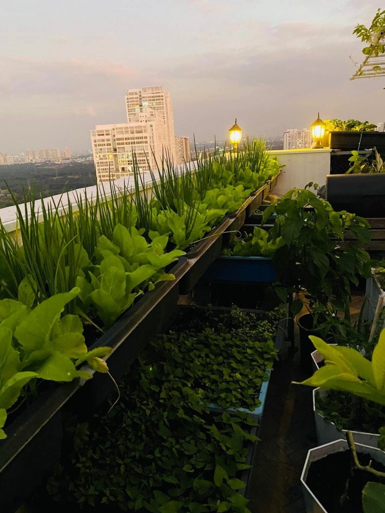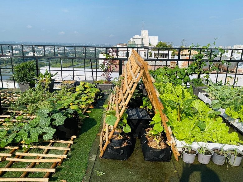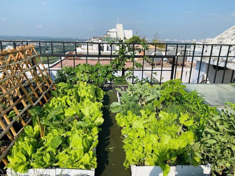 Giữa phố thị "đất chật người đông", một mảnh vườn nhỏ trở nên vô cùng quý giá khi vừa tạo không gian xanh sạch, vừa đảm bảm nguồn rau tươi mỗi ngày. Có lẽ vì vậy mà chị Kiều Nguyễn (37 tuổi, TP.HCM), hiện điều hành một công ty thực phẩm cao cấp chuyên cung cấp cho nhà hàng khách sạn và siêu thị, đã không ngần ngại đầu tư tiền bạc, thời gian và công sức để vun trồng khu vườn trên cao ngay tại sân thượng nhà mình.