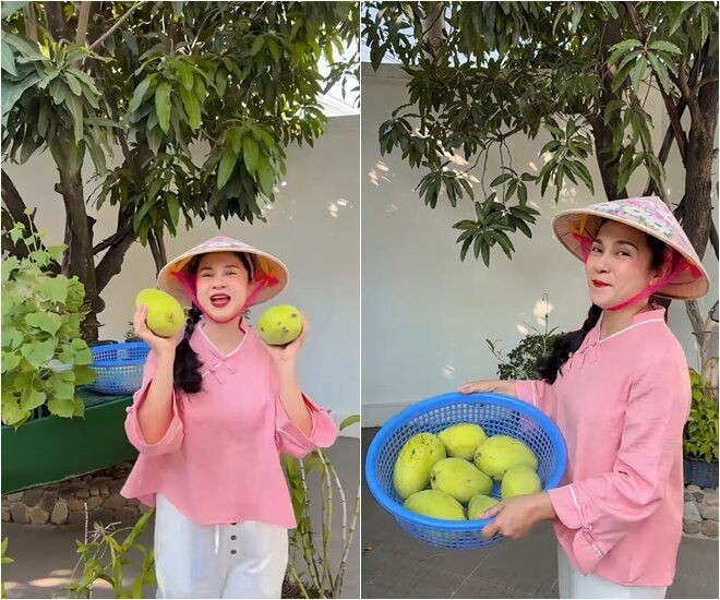 Việt Trinh thích thú nhảy múa bên rổ xoài toàn những trái to đùng mà cô vừa hái được trong vườn nhà. Cô dí dỏm rằng chúng to hơn cả mặt mình.