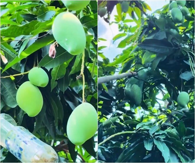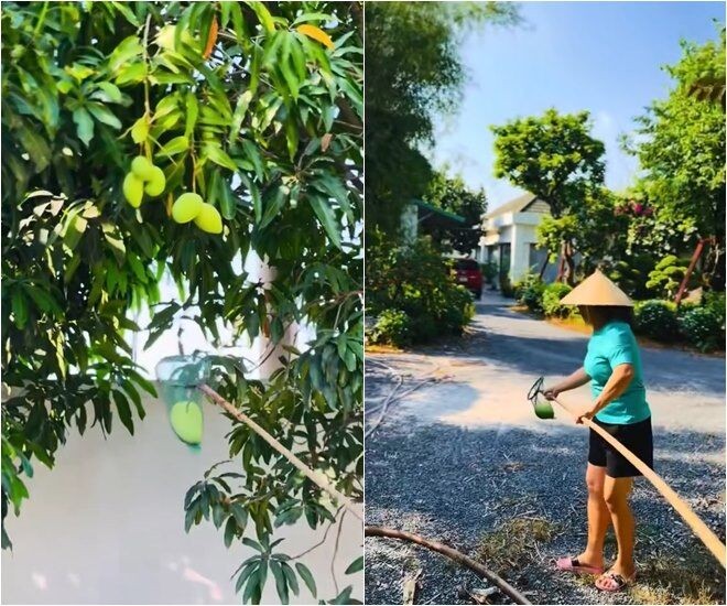 Có thể thấy những chùm xoài lúc lỉu trên cành trong vườn nhà của Việt Trinh. Những trái được hái xuống có kích cỡ rất to. Việc thu hoạch xoài là một niềm đam mê khó tả, mang lại niềm vui đời thường cho "người đẹp Tây Đô" những lúc rảnh rỗi.