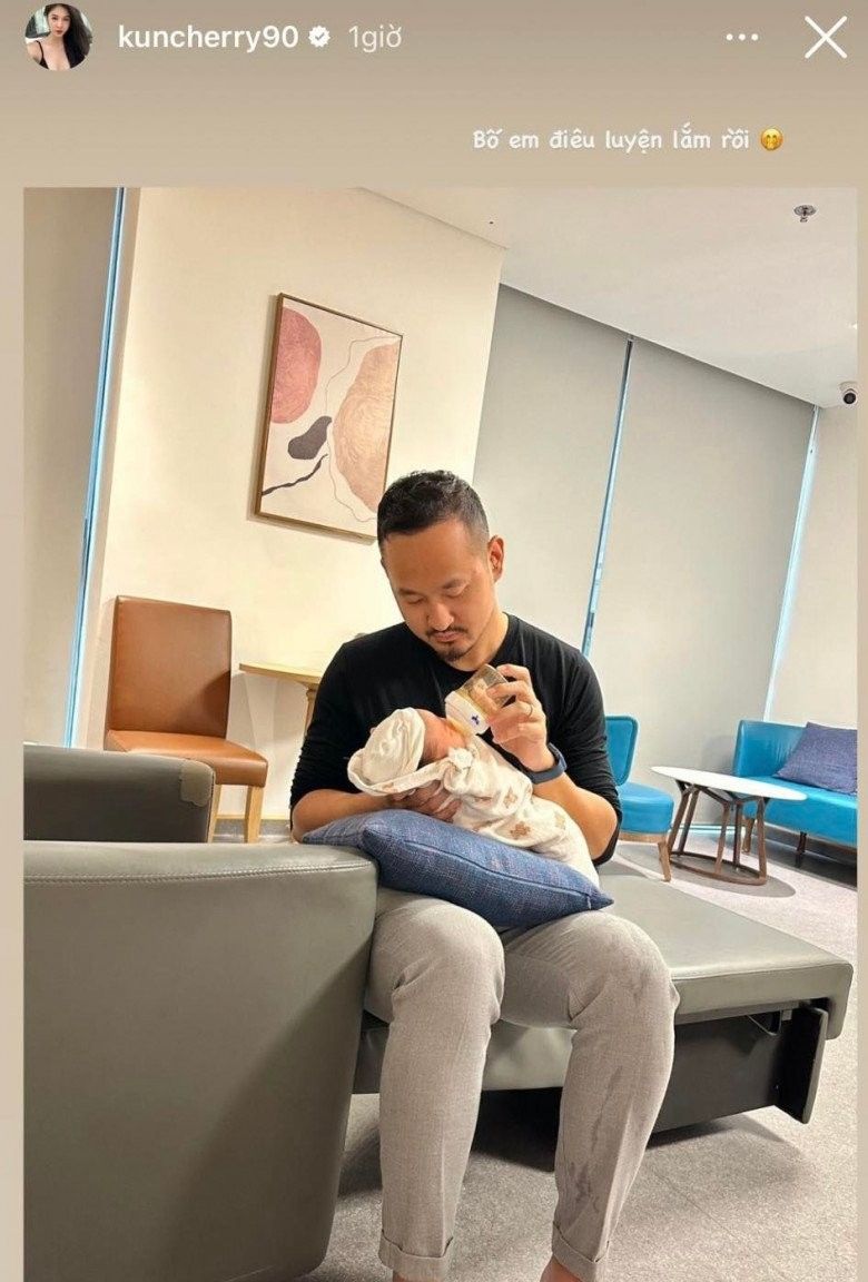 Không chỉ thế, ông bố trẻ lần đầu lên chức nhưng vô cùng khéo léo, đã biết cầm bình cho con tập bú ngon lành. Từng ánh mắt, cử chỉ của doanh nhân Hoàng Nam dành cho con đều cẩn thận và chu đáo khiến bà xã Thu Hoài cũng phải dành lời khen ngợi "Bố em điêu luyện lắm rồi". Còn không ít bà mẹ bỉm sữa chứng kiến cảnh "chồng người ta" chăm con cho vợ sau sinh nghỉ ngơi, dưỡng sức phải chạnh lòng ghen tỵ.