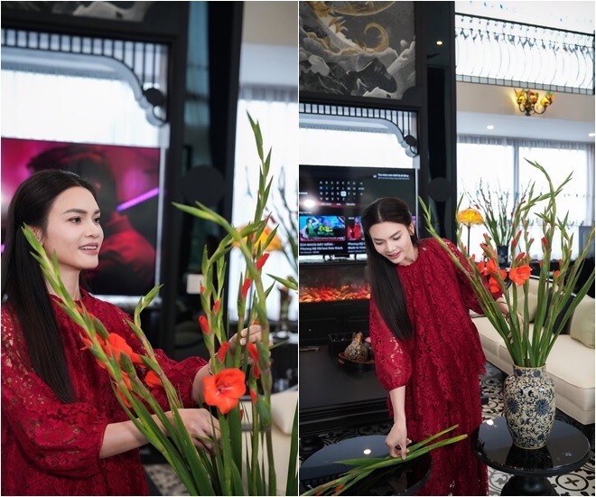 Trong những ngày Tết, không gian sống của nữ nghệ sĩ được khoác lên diện mạo lộng lẫy, kết hợp hài hòa giữa nét truyền thống Á Đông và sự sang trọng, hiện đại. Trước Tết, trên trang cá nhân cô hóm hỉnh chia sẻ: "Áo mới, hoa tươi, nhà cửa tươm tất. Mọi thứ đều dư giả, thiếu mỗi tiền nữa thôi là sẵn sàng đón Tết. Nhà các đằng ấy thế nào?"