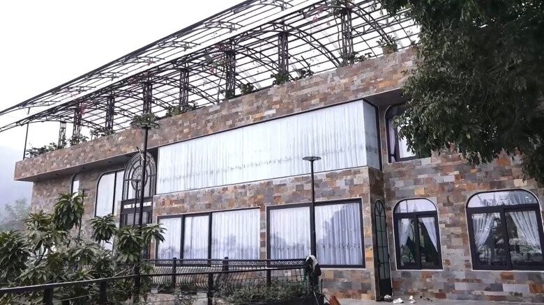 Ngoại thất căn nhà được ốp đá tự nhiên đa sắc với kiến trúc hiện đại, bao quanh là khuôn viên xanh mướt và hệ mái che phía trên sân thượng.