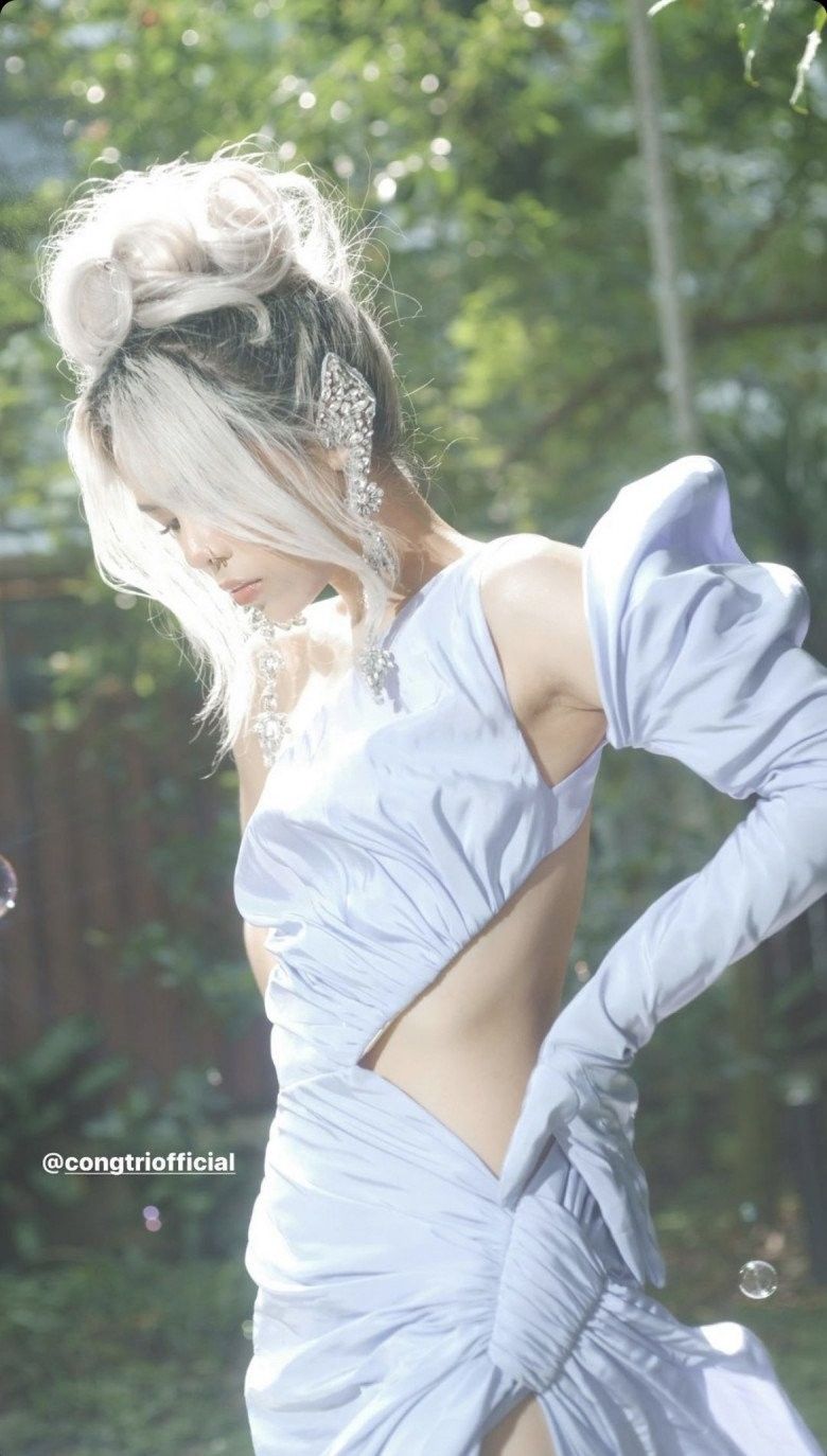 Tlinh xuất hiện với hình ảnh ngọt ngào nhưng đầy quyền lực trong chiếc đầm đạ hội cut out của NTK Công Trí, khai thác được những điểm mạnh trong hình thể lẫn nét thú vị của tlinh trong từng khoảnh khắc.