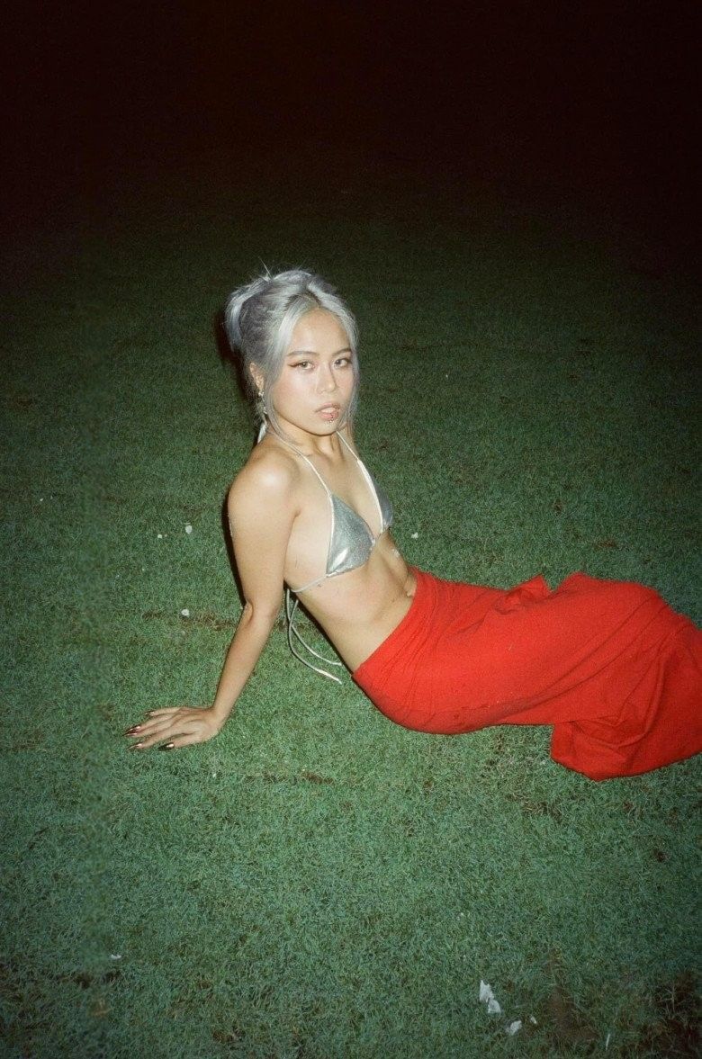 tlinh phối chân váy đỏ ấn tượng cùng áo nội y cách điệu chất liệu ánh bạc đầy ngẫu hứng và sáng tạo.