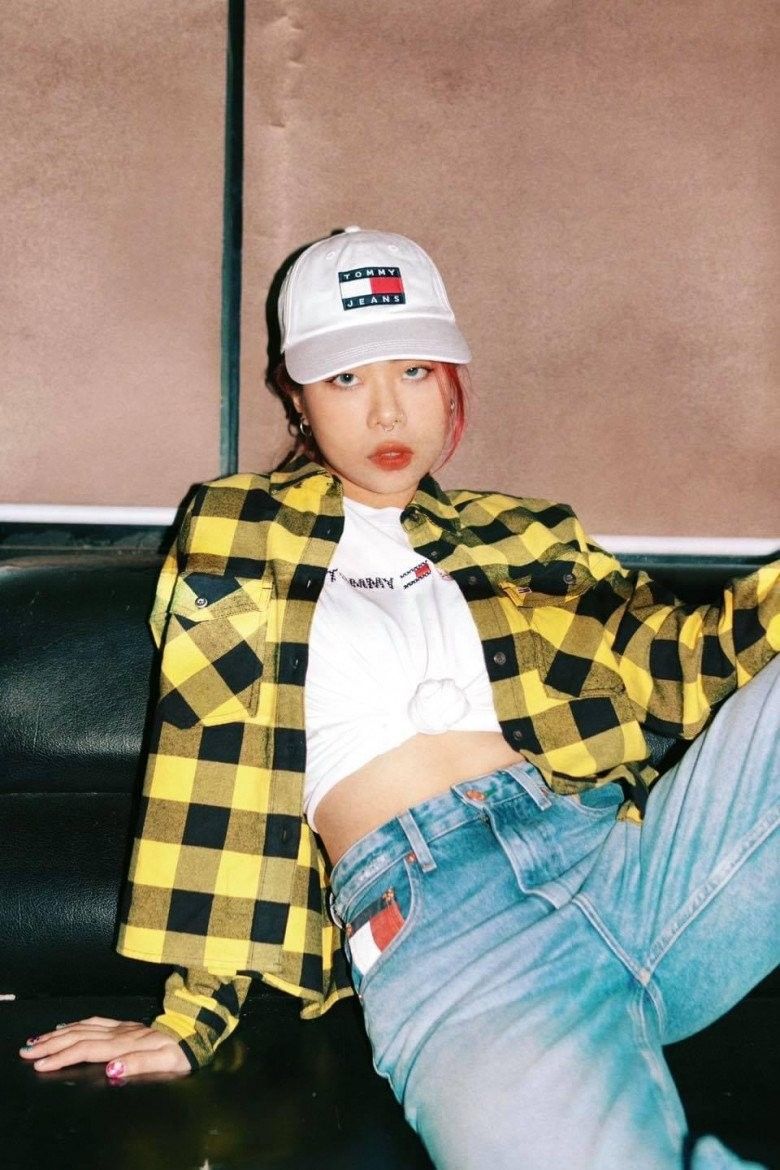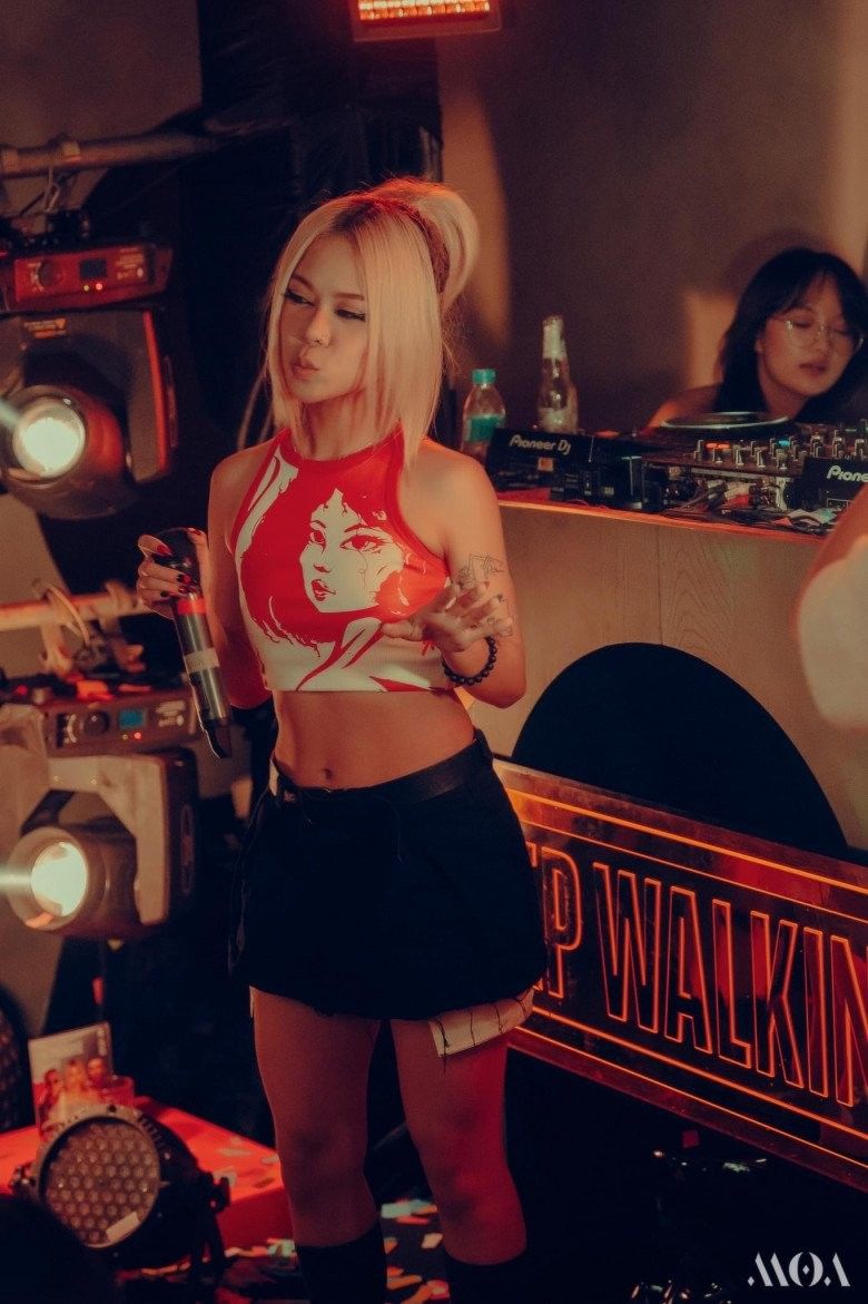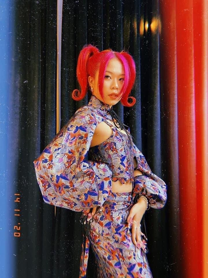 Áo croptop dạng yếm hoạ tiết nổi bật tạo điểm nhấn khi được phối cùng chân váy ngắn hack dáng và chiều cao hiệu quả của nữ rapper nhỏ nhắn mà mi nhon.