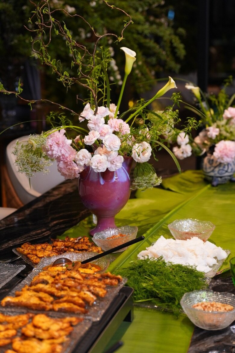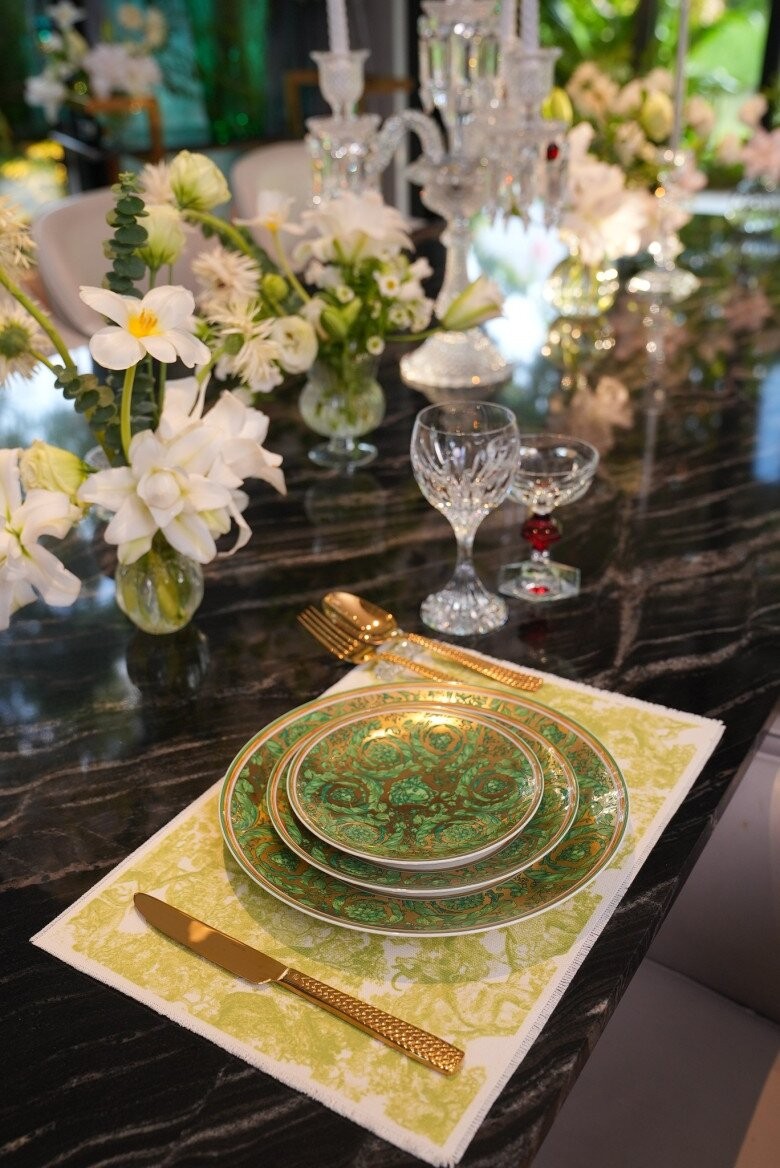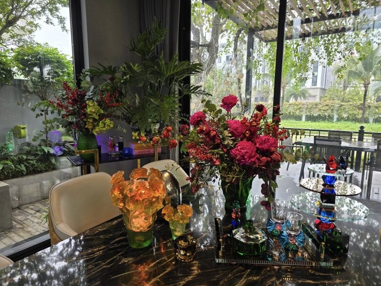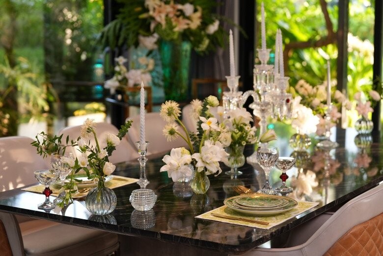 Bàn ăn thường ngày được giữ sự tối giản, sang trọng với hoa tươi và ly pha lê – một phong cách bài trí khiến không gian dù không lễ vẫn luôn có sức sống.