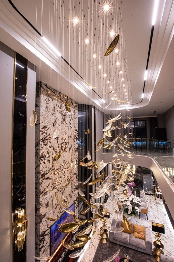 Một góc nhìn từ trên cao xuống cho thấy toàn cảnh phòng khách và bàn ăn, nổi bật với đèn trần thiết kế nghệ thuật và không gian mở hiện đại, đậm chất châu Âu.