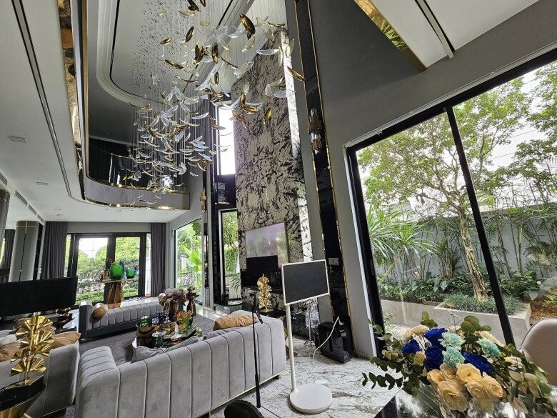 Không gian bếp sang trọng được tận dụng để bày biện một mâm cỗ đủ món, với đầy đủ màu sắc. Khu vực phòng khách cao trần với đèn chùm pha lê lấp lánh và mảng tường ốp đá vân độc đáo, là điểm nhấn nổi bật của biệt thự. Nhìn cảnh Ngô Thùy Linh hóa thân, nhiều người chỉ lo "vòi rồng" trên đầu cô va vào đèn trần.