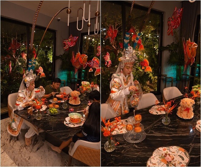 Góc bàn ăn được gia đình nàng hậu trang hoàng rực rỡ với lồng đèn cá chép treo lơ lửng, hoa tươi màu cam nổi bật trên nền bàn đá đen sang trọng. Những chiếc bánh Trung thu được đặt ngay ngắn bên cạnh mâm ngũ quả, tạo nên không gian ấm cúng và truyền thống.