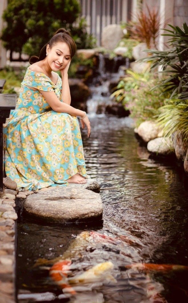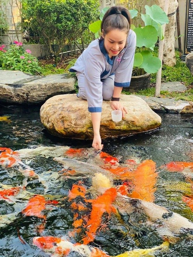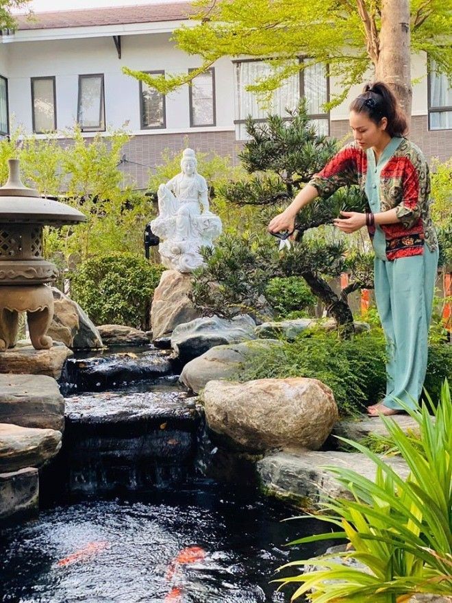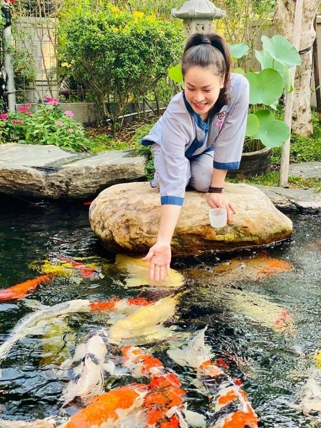 Điểm nhấn của căn nhà là hồ cá Koi rộng với khoảng 10 con cỡ lớn, hai bên quanh hồ đặt đá và trồng thêm cây cảnh. Sau những giờ làm việc mệt mỏi, cô trở về nhà dành thời gian cắm hoa và trang trí cho căn nhà thêm lung linh, ấm áp.