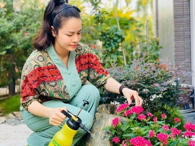 Từ khi dọn về đây ở, dù bận rộn với công việc kinh doanh và hoạt động nghệ thuật, Nhật Kim Anh vẫn dành nhiều thời gian để trang hoàng và chăm sóc tổ ấm. Người đẹp trồng nhiều loại cây, hoa trải dài từ cổng đến sân vườn, chủ yếu là hoa hồng nhập khẩu đắt tiền. Cô cho biết phần lớn các loại cây cảnh và hoa đều được bạn bè tặng. Một góc khác cũng được tận dụng làm vườn rau sạch cho gia đình.
